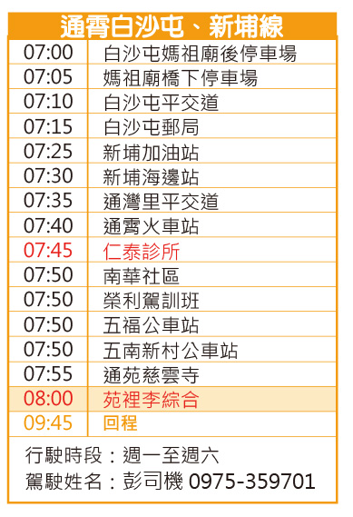 交通指南>醫療專車>苑裡線>通霄白沙屯、新埔線