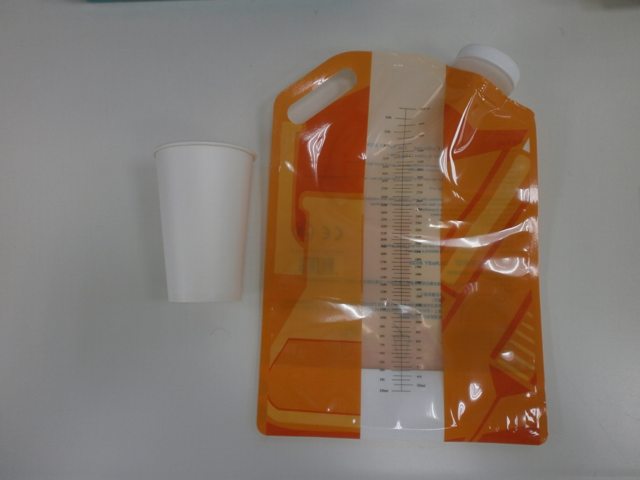 4.全部收集完成後,請將尿袋直立放於桌上,不可平放,再依刻度記錄24小時之總尿量,